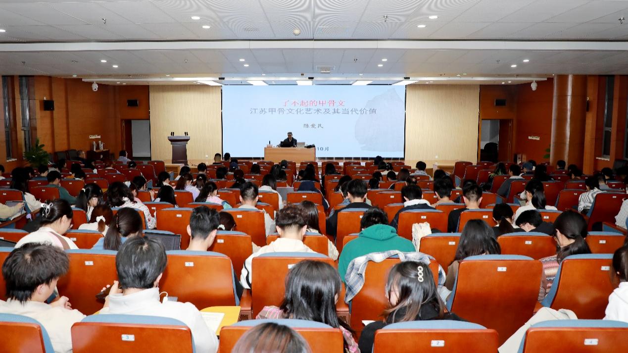 10月27日,我校在图书馆二楼报告厅举行博文讲堂第二十二讲。江苏省甲骨文学会会长陈爱民教授以《了不起的甲骨文:江苏甲骨文化艺术及其当代价值》为题展开深度分享,近300名师生现场聆听了这场跨越三千年的文明对话。讲座由图书与信息党委书记黄艳主持。