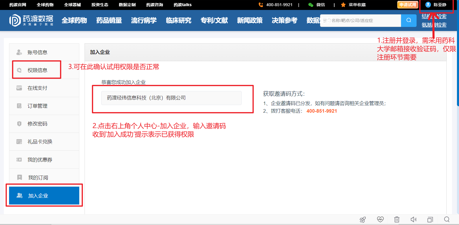 用户注册:在我校IP范围内,用户按照网站注册流程完成注册后,登录进入个人中心,绑定学校域名邮箱(邮箱后缀为@stu.cpu.edu.cn或@cpu.edu.cn);在“加入企业”界面,输入邀请码387be099b2d64e1686ee3d2483636cb9,即可获取访问权限。个人用户注册并关联邀请码后,获得我校相应权限,但不包括中国药品销量模块权限。个人用户可绑定个人微信。