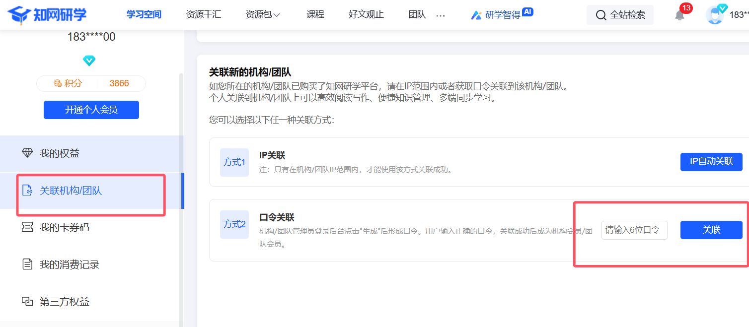 登录个人账号后,点击右上角头像,进入个人中心,输入6位口令进行机构关联EEQ8QH